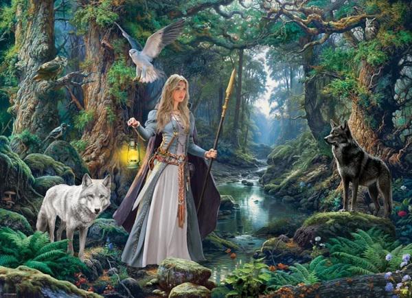 Step into a storybook world. A moonlit forest opens onto a clear stream where a guardian maiden holds a lantern and staff, watched by wolves, owls and forest birds. Rich textures—mossy trunks, flowing water, embroidered garments and soft fur—create plenty of distinct zones for a smooth, magical build.